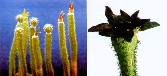 кристатные формы кактусов, как и бесхлорофильные растения, являющиеся «генетическими уродцами», лучше выглядят на высоких подвоях. При этом можно легко оперировать с такими растениями, создавая довольно причудливые формы. Сюда же следует отнести прививку монстрозных форм некоторых кактусов, которые оригинальнее смотрятся в привитом состоянии на высоких подвоях, чем на своих корнях.