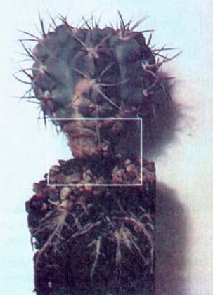 в прививке нуждаются заболевшие кактусы, пораженные корневой или боковой гнилью. Здесь стоит отметить, что если у человека все болезни происходят, следуя народному афоризму, от нервов, то у кактусов – от недостатка солнечного света. Кактусы сохраняют прочную генетическую память о местах произрастания их диких предков. Причем, чем ценнее растение, чем реже оно встречается в коллекциях, тем ближе оно к своим пращурам и тем «крепче» его память. Одинаковый подход к культивированию «домашних» и импортированных из природы растений может стать роковым. Автору приходилось наблюдать, как вполне жизнеспособные импорты начинали желтеть, поражалась корневая шейка и корни. Иногда растения с проявлением первых признаков хлороза удавалось спасти, предоставляя им более сильное освещение или даже перевозя в более южные районы нашей страны. Положительные результаты давала и прививка заболевших кактусов на подвои с высокой вегетативной активностью.