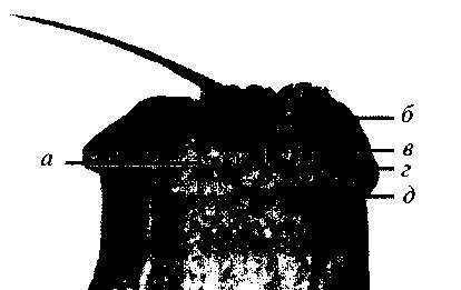 Фото 393. Процесс срастания привитой ареолы Neochilenia vanbaelii с подвоем: а – слой камбиального сращения; б – возбужденная точка роста ареолы; в – трахе-альные клетки; г – ситовидные элементы; д – трахея подвоя.