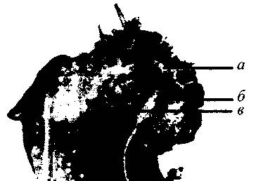 Степень побурения механических элементов различна – от бледно-розовой до темно-коричневой. При микроскопическом исследовании видно, что вокруг включений образуется слой мелких клеток, отделяющих мертвые ткани от живых.