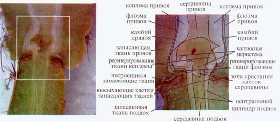 Проводящие клетки древесины не участвуют в процессе восстановления ткани в месте среза. Количество же паренхимных клеток в ксилеме относительно невелико и не может играть решающей роли при регенерации.