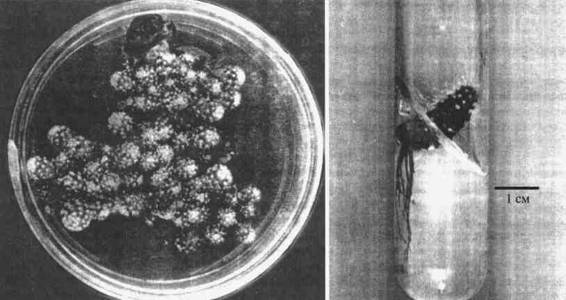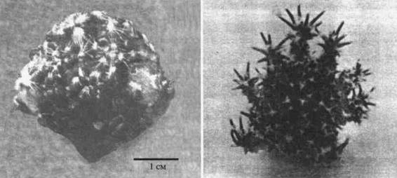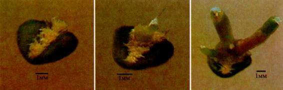 Фото 454. Корнеобразование у клона Ferocactus acanthoides через 95 дней после субкультивирования на безгормональной среде Мурасиге-Скуга. (по J.Ault и J.Blackmon)
