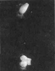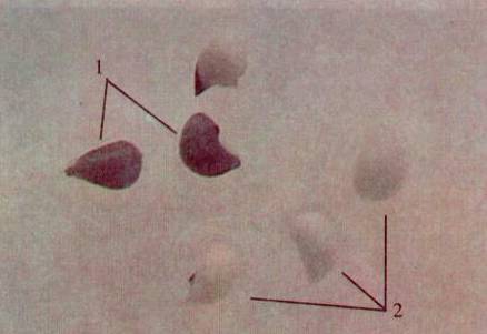 Фото 455. Зародыши Echinocactus horizonthalonius, освобожденные от наружного интегумента (1) и от внутреннего интегумента (2). Внутренний интегумент имеет вид тонкой коричневатой пленочки и насыщен ингибиторами роста клеток – при культивировании на питательных средах его необходимо удалять. На освобожденные зародыши наносят по капле дистиллированной воды в ''елях стимулирования их более успешного набухания
