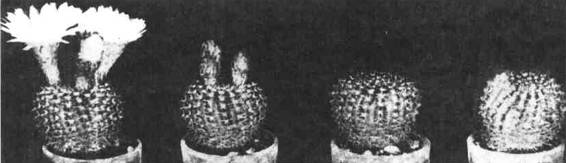 Фото 465. Иллюстрация опыта по определению влияния температуры на процессы цветения Notocactus tabularis, содержащийся в период стагнации при температуре (слева направо) + 10,+15,+20 и+25 °С. (noW.Runger)