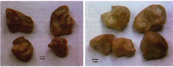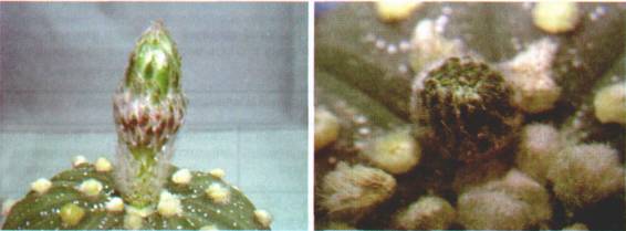 Фото556 – 557. Искусственно вызванная клейстогамия у Astrophytum asterias: типичный бутон (556) и бутон, обработанный смесью ГК3, ДМСО и небольшого количества колхицина (557).