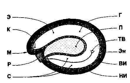 Рис. 126. Строение типичного централыюспер-мального семени: Э – эмбрион К – корень зародыша С – семядоли Г – гипокотиль зародыша П – перисперм Эн – эндосперм ТВ – точка вегетации М – микропиле Р – рубчик