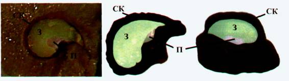 Фото 616-618. Тонированные срезы семян Tephrocactus articulatus (616), Pediocactus [Navajoa] peeblesianus (617) и Astrophytum asterias (618): 3 – зародыш, П – перисперм, СК—семенная кожура.