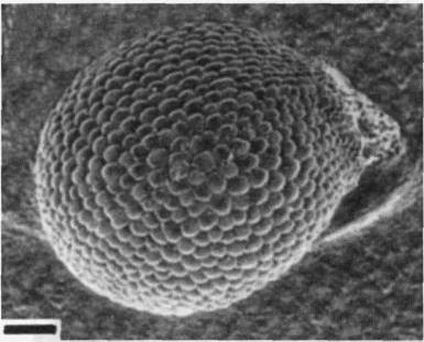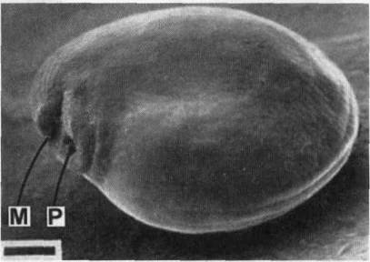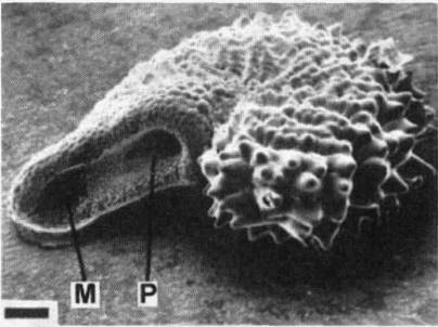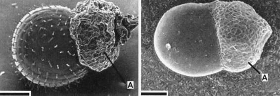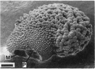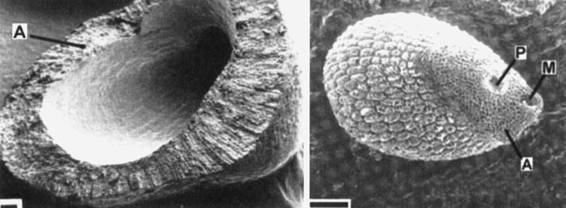 Фото 634 – 635. Ариллус Tephrocactus floccosus (634) и Parodia ayopayana (635) под сканирующим микроскопом. Черта соответствует 200 мк. А – ариллус, М – микропиле, Р – рубчик. (фотографии W.Barthlott и G.Voit)