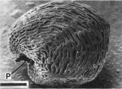 Фото 621 – 627. Семена кактусов под сканирующим микроскопом. Черта соответствует 200 мк; М – микропиле; Р – рубчик, (фотографии W.Barthlott и G.Voit)