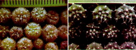 Фото 220 – 221. Сеянцы Gymnocalycium castellanosii, (справа) в возрасте 1 месяца – 2 пикировки и в возрасте полугода —15 пикировок, культивируемые по методу «тургорной разгонки». Габитус не нарушен. Величина деления – 1мм