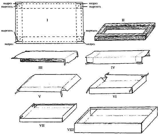 VII. Верхнюю часть длинных сторон загибают вовнутрь и проходят молотком по кромке. Пластинки-язычки прижимают ко внутренней части коротких стенок поддона. VIII. Верхнюю часть коротких сторон загибают вовнутрь и проходят молотком по кромке.