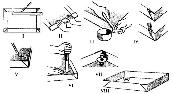Рис. 52. Порядок изготовления поддона из оцинкованного кровельного железа: