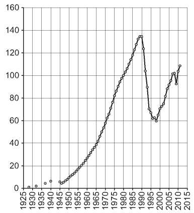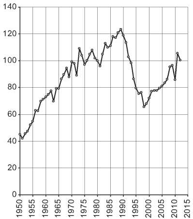 Рис. 2. Индекс объема производства промышленной продукции в России (в сопоставимых ценах, 1980 г. = 100)
