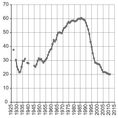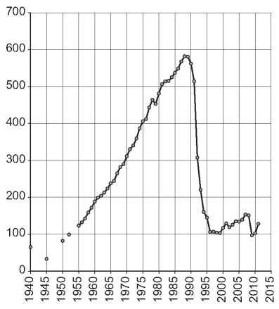 После 1986 г. мы наблюдаем безостановочное и быстрое сокращение поголовья – в том же темпе, как за первые 4 года коллективизации, с той лишь разницей, что нет спасительного изменения и признаков роста. Резкое падение замедлилось лишь в 2005 г. Поголовье скота сократилось за годы реформы в три раза – причем без войны и стихийных бедствий. Сегодня мы имеем поголовье крупного рогатого скота существенно меньше, чем в 1916 г. и даже в 1923 г. – после 9 лет тяжелейших войн (рис. 1).