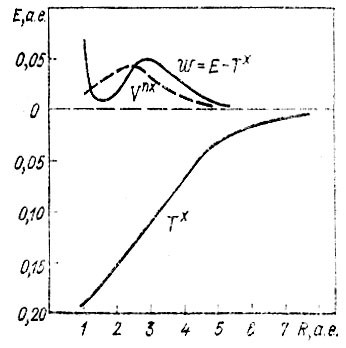 Оказывается, что из Ех можно выделить члены, отвечающие за образование связи. Из рис. 25, на котором изображены полученные Годдардом кривые зависимости величин Tx, Vnx, а также разности w = E – Tx от R, видно, что единственной отрицательной составляющей обменной энергии является Тх, причем ее понижение относительно ТR=∞x превосходит соответствующее изменение прочих составляющих энергии (Δw.) Чтобы объяснить этот факт, перепишем выражения для Tx и Vnx в следующем виде: