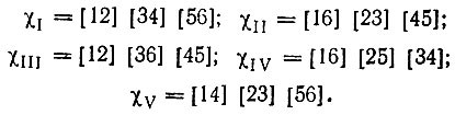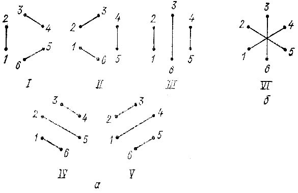 В качестве примера можно привести шестиэлектронную систему. В этом случае можно составить пять диаграмм Румера с непересекающимися штрихами (рис. 13, а). Им соответствуют следующие спин-инварианты: