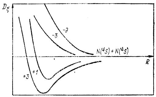 Гайтлер не определял численное значение JQ, он лишь качественно представил кривые энергии взаимодействия Dξ (R) для молекулы N2 (рис. 12).