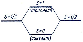 [Закрыть]. Спариванию одноэлектронных спиновых моментов соответствовало бы расщепление молекулярного терма на два – синглетный и триплетный – согласно схеме
