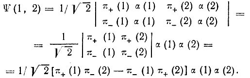 где Р – перестановки 2n-электронов, образующие некоторую группу S2n; bik – матричные элементы некоторого ортогонального неприводимого представления этой группы, реализованного на многоэлектронных функциях определенного терма; JP – параметры возмущения, соответствующие обмену электронов между двумя одноэлектронными бесспиновыми состояниями; δik – символ Кронекера; х – обусловленная возмущением поправка к энергии (в первом приближении). При этом Гайтлер специально отмечает, что он будет «проводить вычисление возмущений только для таких систем А и В, каждой из которых соответствуют антисимметричные термы» [48, с. 848]. Однако речь здесь идет об антисимметрии относительно перестановок только пространственных координат. Далее Гайтлер отмечает, что "представление[5]5
