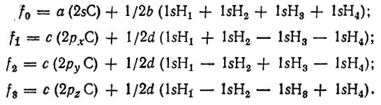В качестве примера рассмотрим молекулу метана СН4. Канонические МО, представленные линейными комбинациями валентных АО для молекулы метана, могут иметь вид: