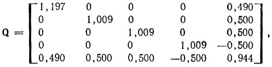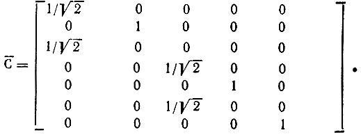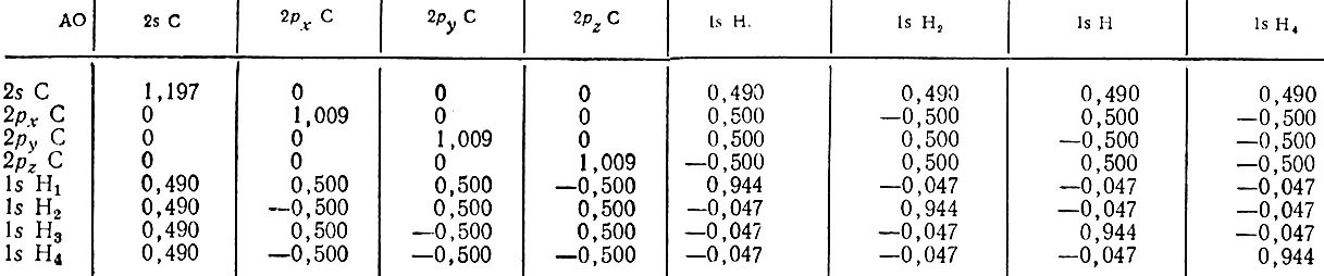 Рассмотрим теперь в качестве примера, иллюстрирующего метод проектирования, данные по локализации МО и гибридизации АО в молекуле метана, полученные нами на основе расчетов в приближении полного пренебрежения дифференциальным перекрыванием. В табл. 6 приведена одноэлектронная матрица плотности Р для молекулы метана, равновесная геометрия и ориентация в пространстве которой определяются данными табл. 7. Вычислим двухцентровую МО, локализованную на связи С-H1. Для этого выделим из матрицы Р блок, соответствующий орбиталям атома углерода и атома водорода H1: