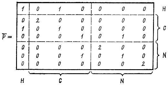 Для молекулы HCN заселенность 1s-орбитали водорода равна 0,855 и, следовательно, заселенность гибридной АО углерода h2C равна 1,145. Так как сумма заселенностей всех σ-орбиталей углерода составляет 4,099, заселенность его h3С-ГАО равна 0,954. Определяя теперь порядки связей (недиагональные элементы матрицы Р) как среднегеометрические значения соответствующих заселенностей (диагональных элементов матрицы