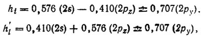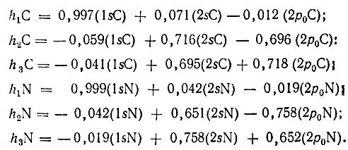 В рассматриваемом примере (HCN) гибридные АО выражаются через исходные сферические АО согласно следующим равенствам: