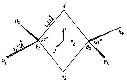 Гибридные АО бора h1 и h2, ориентированные к периферийным атомам водорода H1 и Н2, образуют угол 120°; угол h'j-орбиталями, ориентированными к мостиковым атомам водорода H'j, существенно меньше и составляет 102° (ср. с углами на рис.19).