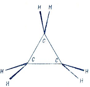 Интересный елучай представляет молекула циклопропана, особенностью которой, отличающей ее от молекул большинства других органических соединений, является аномально-малый угол между связями С-С. Три атома углерода в циклопропане образуют правильный треугольник с углами в 60°, что существенно меньше обычных значений 109,5° для насыщенных и 120° для сопряженных ненасыщенных соединений (рис. 20).