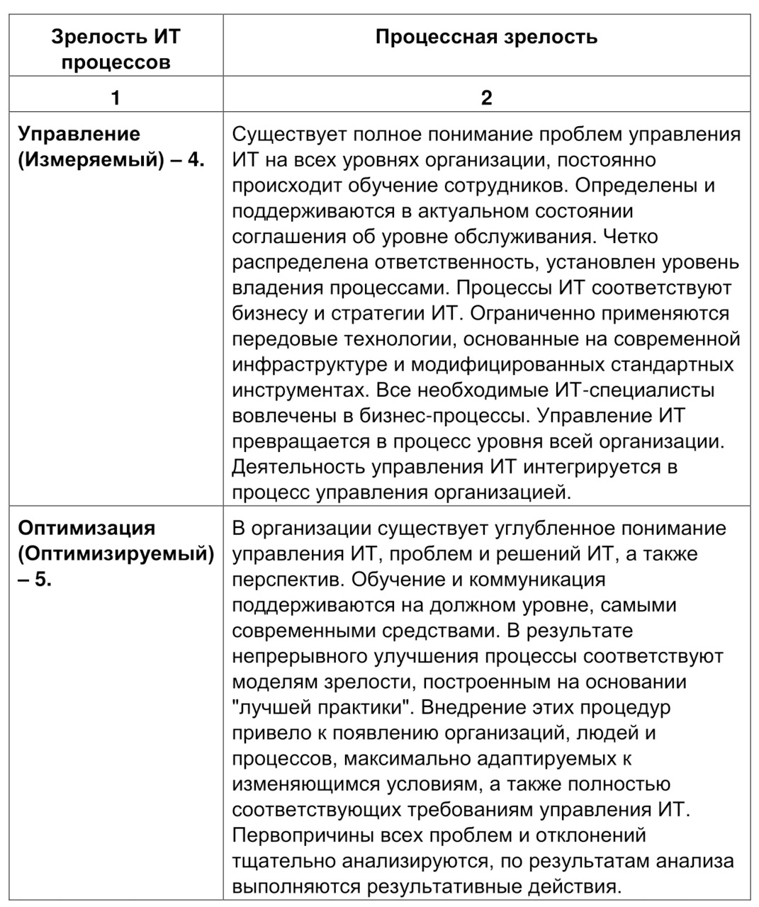 И замыкает модель зрелости процессов ИТ уровень – «Оптимизация (Оптимизируемый)», на котором информационные технологии интегрированы в бизнес-процессы, полностью их автоматизируют, предоставляя возможность повышать качество и эффективность работы организации (см. таблицу 3).