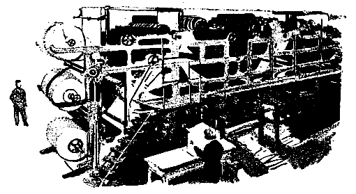 К ротационной машине подкатывались рулоны бумаги -бумажные катушки величиной с громадную бочку.
