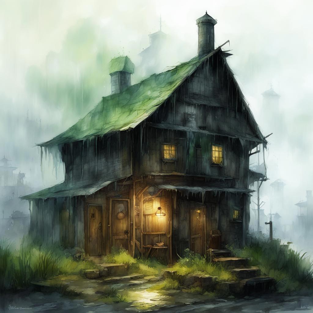 Скользя по грязи и отворачивая лица от хлёстких капель дождя, эти двое добрались до хижины и аристократ громко постучал набалдашником трости в дверь. Вскоре она открылась, и хозяин, седовласый старичок с торчащими во все стороны волосами и с гогглами на лбу, пропустил их внутрь.