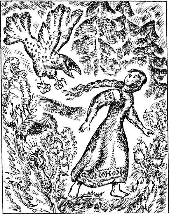 А за тальниками, в глубь болота, лабда раскинулась. И вот на лабде-то в темноте, при свете звезд, стало видать: лежит в осоке девушка, руками, ногами от коршуна отбивается, а коршун-то налетает на нее, крыльями бьет и клюет куда попадя! Выше над ними сова мечется, кричит и плачет, но близко к коршуну не подступает, – боится не совладать.