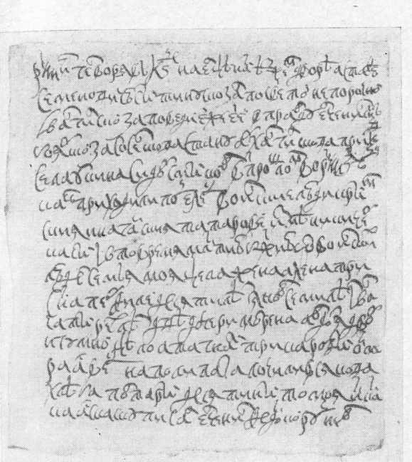Скоропись, XVII в. (Сказка ельчанина Сидора Смыкова, написанная ельчанином Федоской Рудневым, о том, что в приход крымских татар и других воинских людей семья его, двор и гумно остались целы, а отогнан скот и потолочено в поле всякого хлеба три десятины.—ЦГАДА, Разр. приказ, Бел., стлб. 412, л. 764)