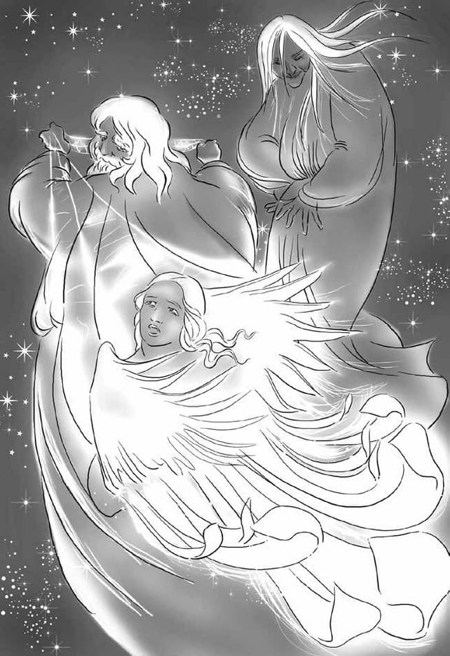 – Будь по-твоему, – говорит Комета. Срезала она у старика кусочек одежды, накрыла им старуху. Сбросила Голубика старое платье и засияла молодым ярким светом, в сто раз ярче, чем прежде.
