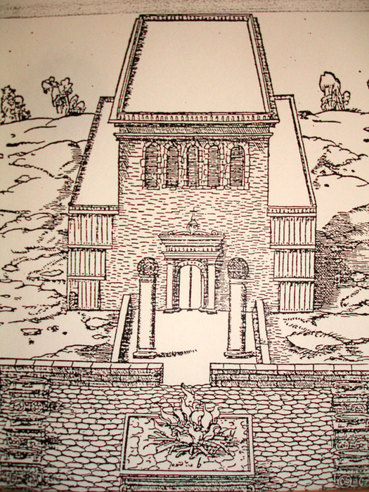 Как и Скиния, Храм в Священном Писании описывается очень подробно, и все же нам трудно представить себе, как он выглядел. Обычно, в реконструкциях, его изображают близким к вавилонской архитектуре, с характерными зубчатыми украшениями на фасаде, о которых упоминает и Библия. Впрочем, общая композиция Храма достаточно очевидна. В целом она, естественно, повторяла очертания Скинии: большой двор, а в нем – вытянутое в плане помещение, разделенное завесой на святилище и Святая святых. Ковчегу, как и раньше, предназначалось кубическое по форме пространство, куда лишь раз в год, в Йом-Киппур (Судный день, самый важный из иудейских праздников), мог входить первосвященник. Это помещение получило название «давир». В святилище вновь расположились светильник, жертвенник для воскурений и стол для хлебов предложения. Рядом с большим жертвенником, вместо сосуда для омовений, во дворе установили «море» – огромный чан с водой на 12 медных быках. В отличие от Скинии, у Храма появился притвор и вспомогательные помещения по бокам, стоящие рядом, но не соприкасающиеся со священными стенами храма. Отделка здания была очень богатой – снаружи мрамор, внутри кедровое и кипарисовое дерево, обшитое золотыми листами.