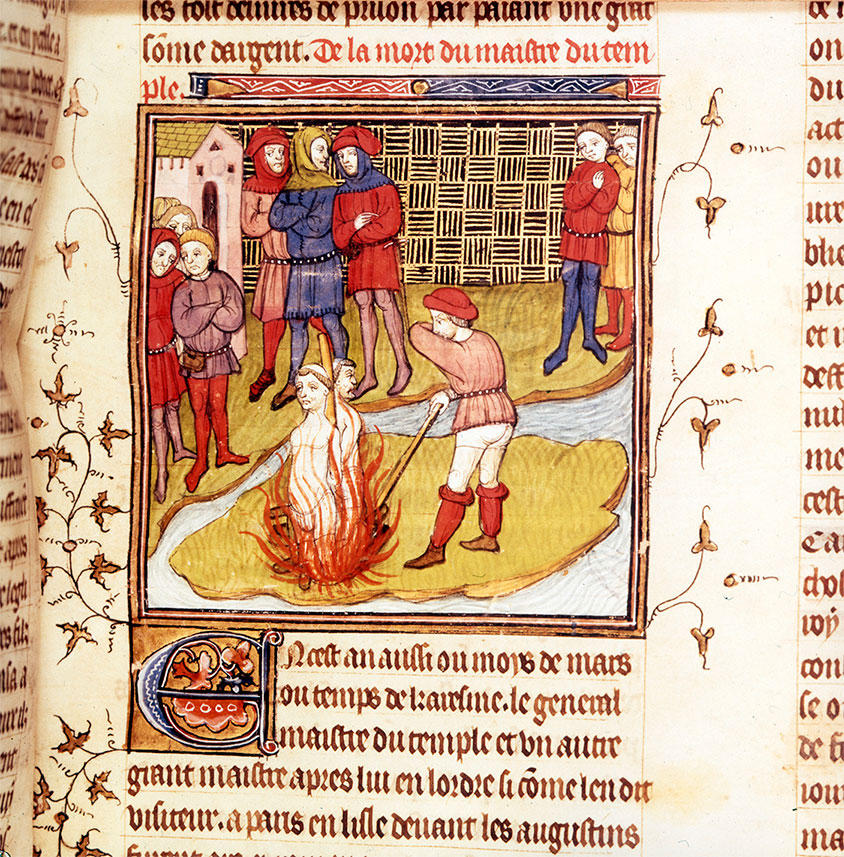 История ордена тамплиеров закончилась трагически. Великого мастера Жака де Моле и его сподвижника Жоффруа де Шарне по приговору суда сожгли в Париже, на острове Сите, недалеко от собора Парижской Богоматери. Казнили и многих рядовых членов ордена. В манускрипте «Французские хроники Сен-Дени» («Chroniques de France ou de St Denis»), или «Большие французские хроники» («Grandes Chroniques de France»), где собраны записи монастырских и придворных летописцев с 1270 по 1380 г., эти события не только описаны, но и зарисованы.