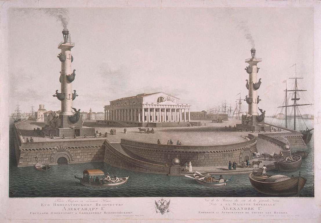 Рис. 5.16. Вид Биржи со стороны Большой Невы в Санкт-Петербурге. Архитектор Тома де Томон. 1810 г. Гравюра с раскраской И. В. Ческого по рисунку М. И. Шотошникова[154]154