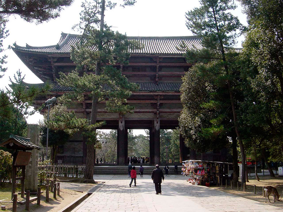 Главные ворота буддийского храма Тодай-дзи. Комплекс был основан в VIII веке императором Сёму, несколько раз разрушался и восстанавливался вновь после пожаров и землетрясений.