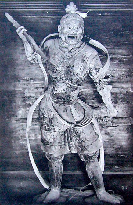 Скульптура бодхисатвы Ваджрапани – стража, стоящего у монастырских ворот Ниомон и защищающего их от проникновения порока. Этот воин не слишком велик (167 см), но могуществен и не может пожаловаться на короткий век. Установлен в зале Хоккедо (Зал лотоса) в Тодай-дзи.
