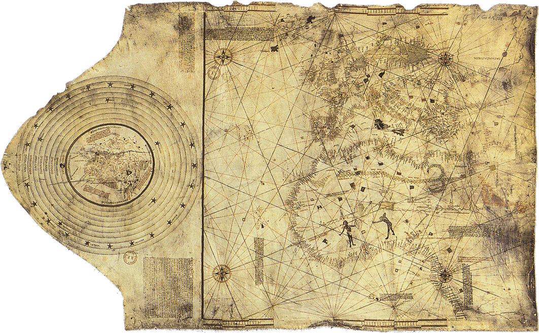 До того как отправиться на поиски новых путей в Индию, братья Колумбы, Бартоломео и Христофор, как известно, работали картографами. Карта северо-восточной части Атлантического океана из французской национальной библиотеки была предположительно создана в мастерской Колумбов в Лиссабоне. Слева на ней (круглая, в мелком мас штабе) – вся Вселенная.