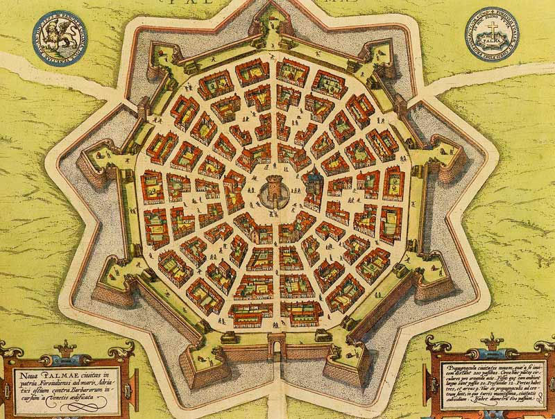 Если зайти в компьютерную программу Google Earth, то можно убедиться, что итальянский город Пальманова сегодня имеет те же звездные очертания в плане, что и на карте из «Атласа городов земного мира», изда вавшегося в Кёльне в 1572–1619 гг. теологом Георгом Брауном и гравером Францем Хогенбергом.