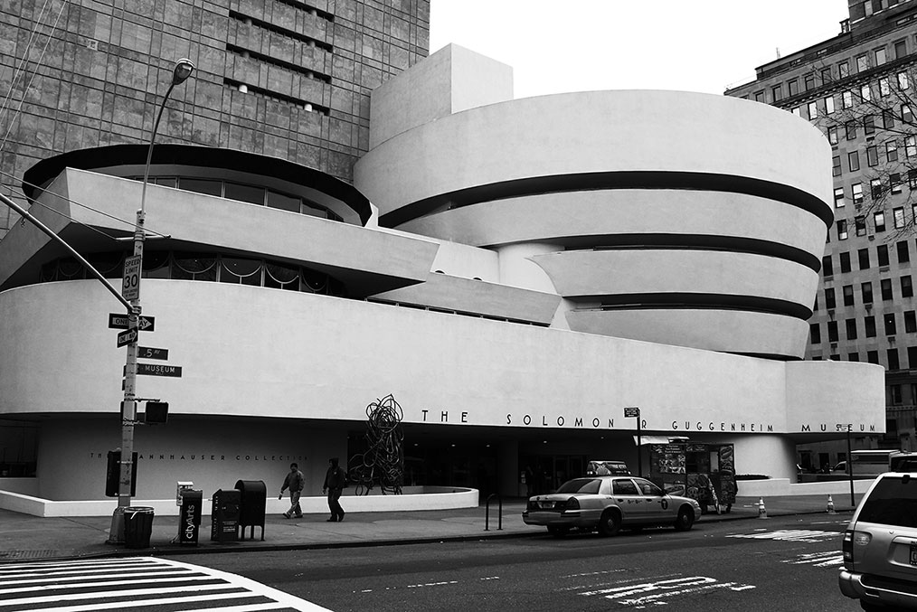 Главная идея оригинального композиционного решения здания Музея Соломона Гуггенхайма состояла в том, что посетитель должен подняться на лифте на верхний этаж и затем, знакомясь с экспозицией, постепенно с пуститься по спиральному пандусу.