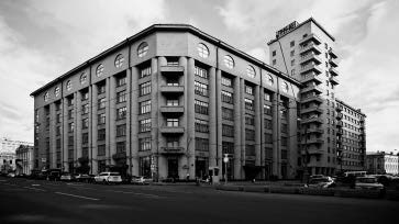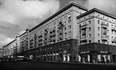 Жилой дом общества «Динамо», спортивного клуба НКВД. Москвичам, заставшим советское время, он памятен по знаменитому «40-му гастроному», в котором что-то можно было купить и в эпоху всеобщего дефицита. На фасадах – «красная» дорика, она же – «пролетарская классика». Своей творческой находкой Иван Фомин считал применение спаренных опор. Одиночная таких же пропорций выглядела бы очень массивной и далеко выступающей за линию фасада.