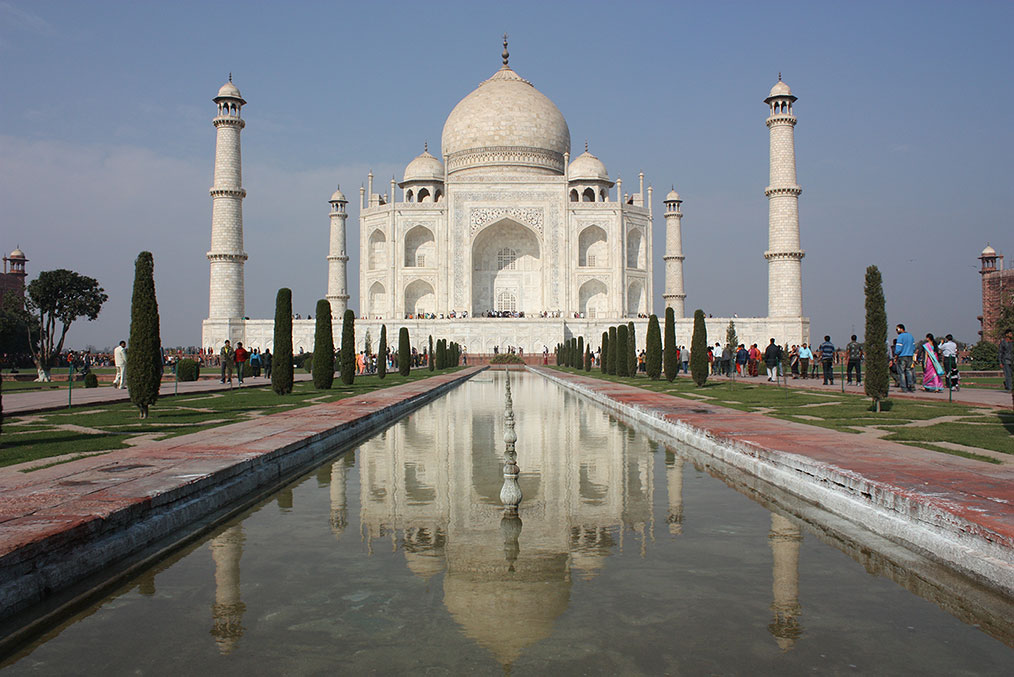 Мавзолей-мечеть построен по приказу потомка Тамерлана – императора Великих Моголов Шах-Джахана в память о жене Мумтаз-Махал, умершей при родах. Император планировал возвести для себя отдельную гробницу на другом берегу реки Джамна – такую же, только черную. Однако, свергнутый собственным сыном, не смог завершить задуманное и после нескольких лет заточения был похоронен рядом с любимой супругой. Помимо прочих достоинств, это здание является примером творческой работы с особым пространством, не внешним и не внутренним. Стройные минареты отмечают незримые границы, внутри которых пространство как будто концентрируется, образуя особую художественную среду. Здесь важную роль играют айваны – сводчатые ниши на поверхности стены, делающие здание «проницаемым», одновременно открытым вовне и пропускающим взгляд в собственные недра.