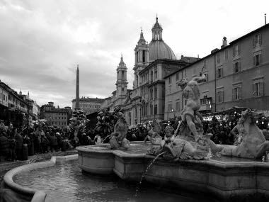 Праздник Эпифании, бурно отмечаемый римлянами, помогает еще острее почувствовать интенции барочного зодчества: «принуждение» к восприятию в ракурсе, отступ части фасада от красной линии, скругленность углов. Но и тогда, когда толпа разойдется, обелиск и фонтаны останутся на своих местах, мешая нам смотреть на памятник строго фронтально.