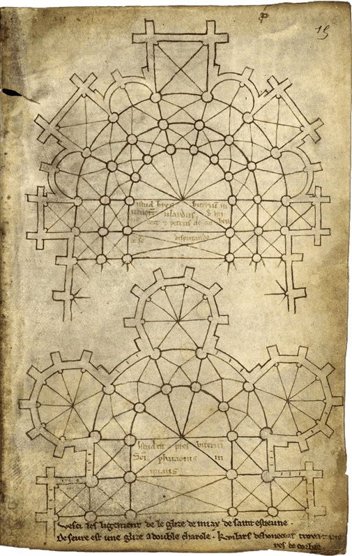 Верхний чертеж со страницы альбома средневекового зодчего Виллара де Оннекура демонстрирует достижение компромисса в споре с его коллегой Пьером де Корби по двум позициям. Во-первых, венец капелл состоит из чередующихся прямоугольных и полукруглых в плане сооружений. Во-вторых, прямоугольные капеллы перекрыты традиционными крестовыми сводами (они и сегодня обозначаются на планах диагональными линиями), а полукруглые – общим для них и деамбулатория сводом из пяти распалубок.
