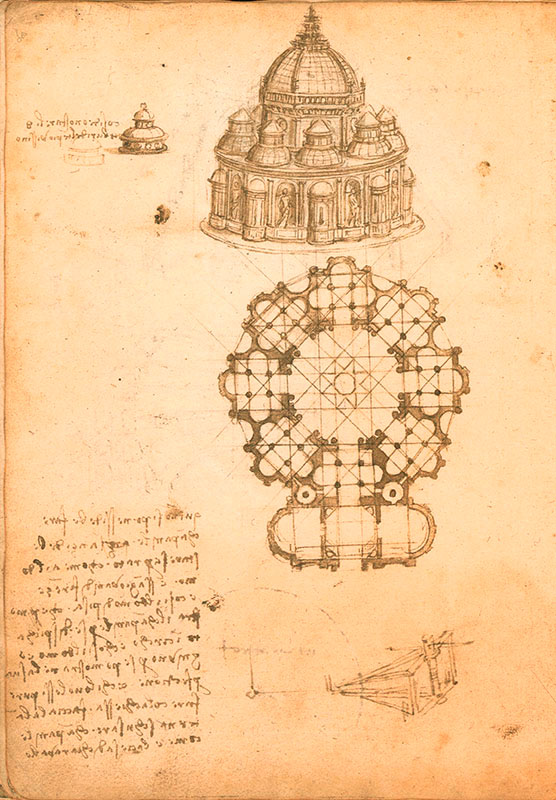 Леонардо очень интересовала тема центрических в плане храмовых сооружений. Возможно даже, что он обсуждал ее с Браманте – будущим строителем собора Святого Петра. В данном проекте купол, безусловно, символизирует небесный свод. Центрическое здание не соприкасается с другими, стоящими по соседству, и сохраняет обширное пространство вокруг себя. Оно не изображает Вселенную, но условно повторяет схему ее устройства, какой она представлялась ренессансной науке.