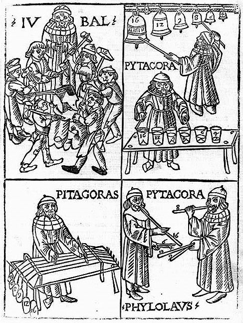 Лас Гермионский, с которым согласны последователи пифагорейца Гиппаса из Метапонта, полагая, что частота колебаний, от которых получаются консонансы, соответствует числам, получил такие соотношения на сосудах. Взяв равные по объему и одинаковые по форме сосуды и один из них оставив пустым, а другой наполнив водой наполовину, он извлекал звук из того и другого, и у него выходила октава. Затем он оставлял один сосуд пустым, а второй наполнял водой на одну четверть, и при ударе у него получалась кварта. Квинта получалась, когда он заполнял второй сосуд на одну треть. Таким образом, отношение пустоты одного сосуда к пустоте другого составляло: в случае с октавой – 2: 1, с квинтой – 3: 2, с квартой – 4: 3.