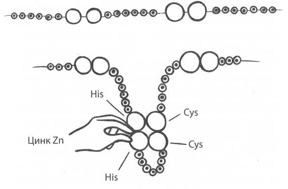 Свое странное название эти фрагменты белковых молекул получили за характерную трехмерную структуру и наличие в их составе ионов цинка. Цинковый палец представляет собой последовательность аминокислот, состоящую из пары близко расположенных цистеинов (аминокислотных остатков), потом следует промежуток в полтора-два десятка любых аминокислот, и опять идут два близко расположенных цистеина или гистидина. Ионы цинка стабилизируют, удерживают эту конструкцию, связываясь координационными связями с двумя близко расположенными цистеинами. Представьте себе веревку с четырьмя завязанными узелками – это будут цистеины или гистидины. А теперь пальцами притяните все узелки в одну точку. Ваши пальцы сыграли роль иона цинка. У вас получатся три петли, которые можно назвать тремя пальцами. Так вот, каждый палец достаточно точно узнает три-четыре нуклеотида ДНК, расположенные в определенном порядке, и связывается с ними. Три пальца уже распознают девять-десять нуклеотидов – определенное слово генетического текста.